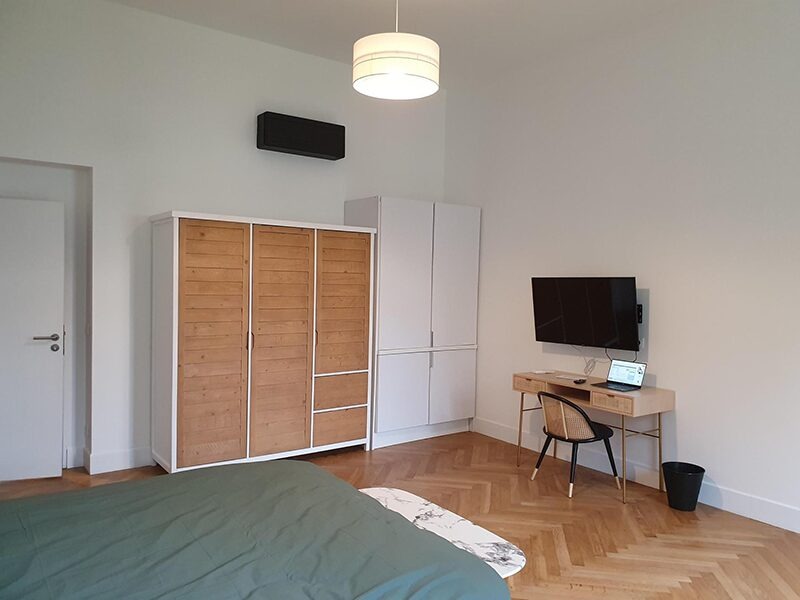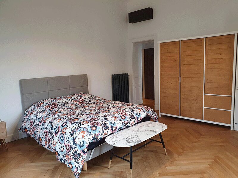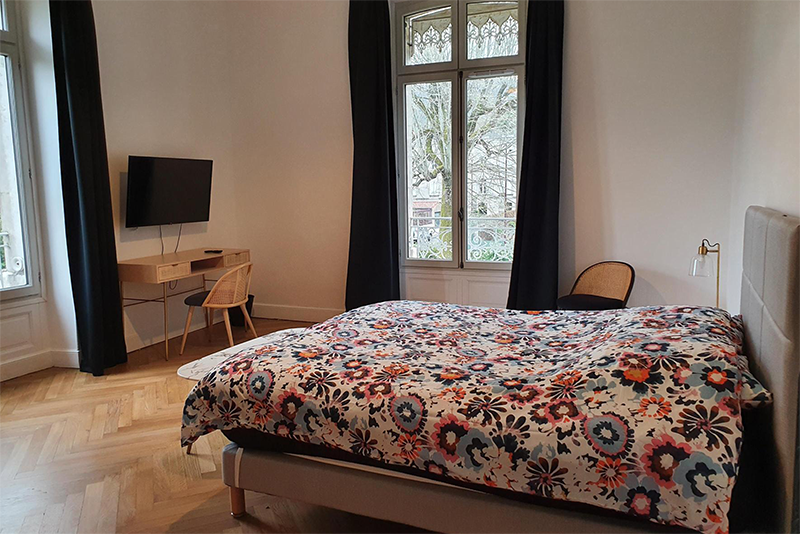 Les chambres sont à l’étage, dont 5 au premier étage et 5 au deuxième étage. Chaque chambre est climatisée et possède sa salle de bain privative et une kitchenette. Les chambres mesurent entre 22m² et 28m². Elles sont meublées mais peuvent être décorées par les colocataires.
