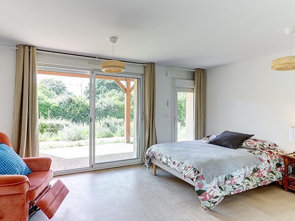 La Maison est entourée d’un grand jardin arboré de 1500m², doté d’un potager et d’un poulailler. La Maison est adaptée aux personnes se déplaçant avec déambulateur et fauteuil roulant.