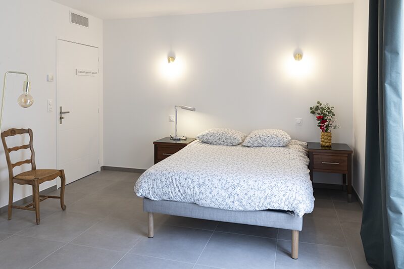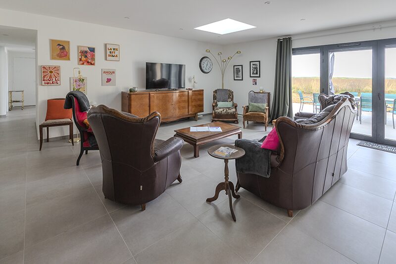 Les espaces de vie commune sont chaleureux et décorés soigneusement avec du mobilier de qualité. Ils sont composés d’un grand séjour lumineux avec de grandes baies vitrées donnant sur la terrasse et le jardin, et d’une cuisine ouverte équipée.